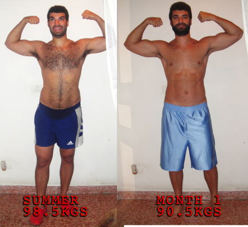 I took all the poses suggested in the P90x website to show development from all sides. Here they are. Day 1 versus Month 1. 98.5kgs versus 90.5kgs.